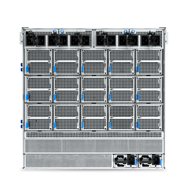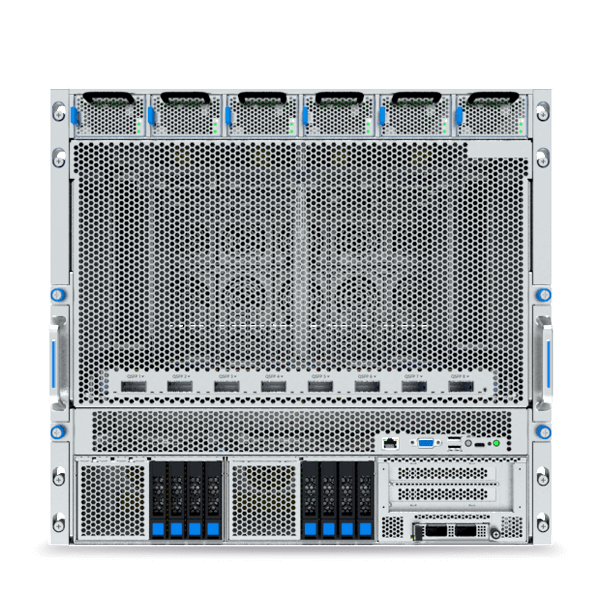 Housed in a 10U chassis, the system supports up to eight U.2 NVMe SSDs to ensure high-speed local access to large training datasets. The motherboard-integrated NVIDIA ConnectX®-8 SuperNIC™ network adapter effectively reduces latency and enhances throughput in distributed environments, tightly integrating compute, storage, and networking to fully support large-scale, high-performance AI applications.